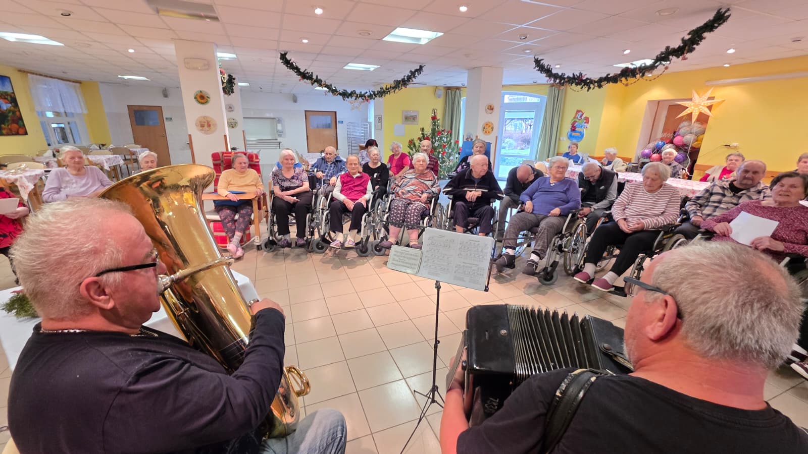 Ve čtvrtek 11. 12. 2025 jsme v našem Domově s velkou radostí přivítali již známé muzikanty Jiřího a Oldu Mifkovy, kteří k nám přišli zahrát a zazpívat vánoční koledy.